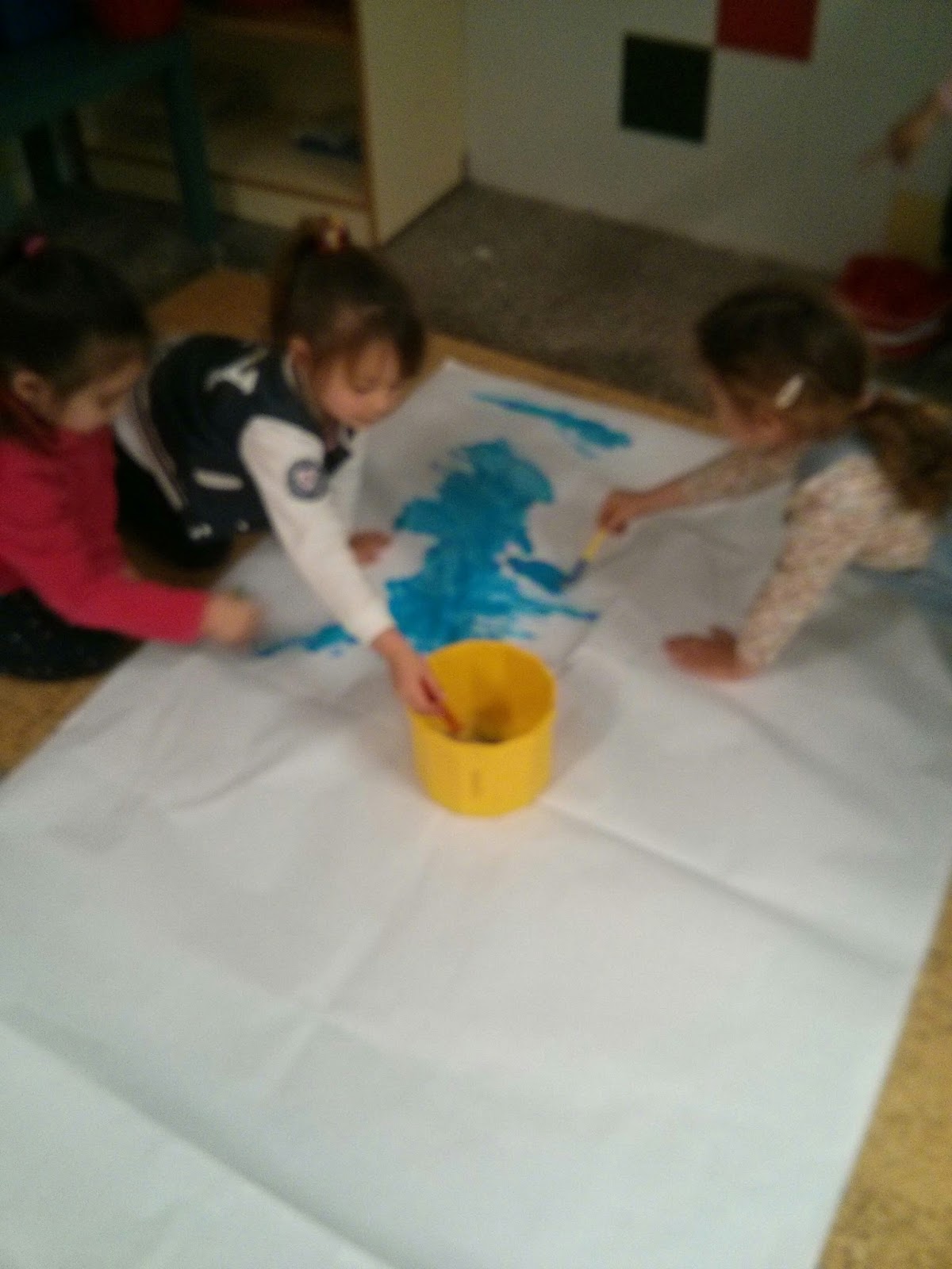Primero, por supuesto, los deseos de empezar algo nuevo. Comienza la primavera y queremos celebrarlo bien. Hablamos y escribimos nombres y dibujos de flores, de pájaros, de insectos... Comparamos letras, palmeamos sílabas y decidimos que tenemos que realizar entre todos algo especial, alusivo a lo primaveral. Así que: papel contínuo y pintura van a ser las bases para nuestro trabajo. Azul para el cielo y verde para la hierba. La idea es colocarlo en la puerta si el material soporta los dobleces. Si no es así, lo colocaremos en una pared de la clase con todos los elementos que podamos añadir para un paisaje de nuestra estación favorita. El trabajo ya está en marcha, como véis. Ya mismo, el resultado final...