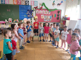 El 24 de noviembre Lázaro cumplió los 3 añitos y el viernes 23, tal como vino deseando desde hacía días, fue el primero de las filas con todo el derecho del mundo. Acogió con alegría la corona cumpleañera, y disfrutó con la atención, los cánticos de sus compañeros y también con la tarta "especial" de la clase. Como colofón, posó con la mascota, repartió unos regalitos entre todos y nos cantó una canción con un micrófono de lo más original. ¡Feliz cumpleaños, Lázaro! Aquí tienes también tu tarta virtual.